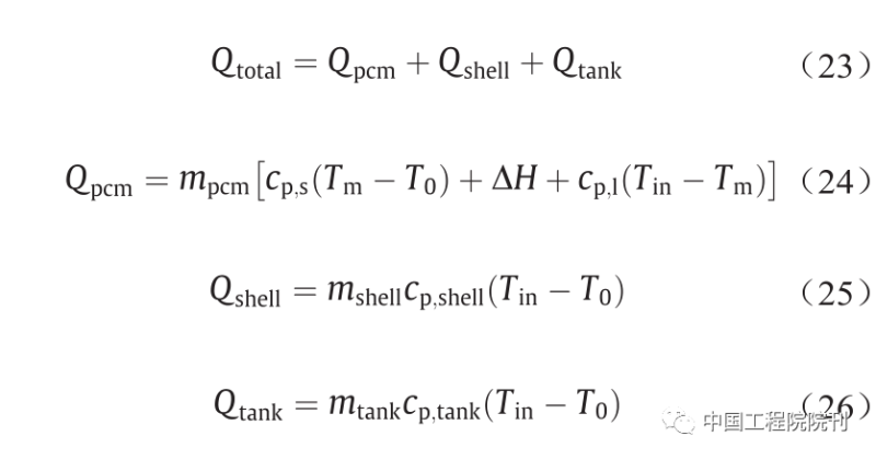 式中,Qpcm、Qshell和Qtank分別是相變材料、相變材料膠囊殼和儲罐中的熱量存儲;mpcm、mshell和mtank分別是相變材料的質量、相變材料膠囊的外殼和儲罐的質量;Cp,s和Cp,l是固態(tài)和液態(tài)相變材料的比熱容;Tm、T0和Tin分別是熔化溫度、初始溫度和入口溫度;Cp,shell和Cp,tank分別是外殼和儲罐的熱容量。