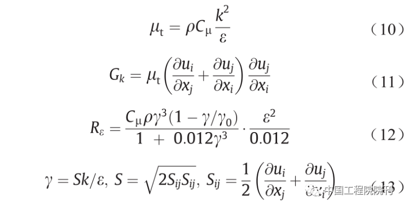 式中,Cμ是模型常數;γ是RNG k-ε湍流模型系數;γ0是初始狀態(tài)下的RNG k-ε湍流模型系數;S是流體的平均應變率;Sij 是變形張量。