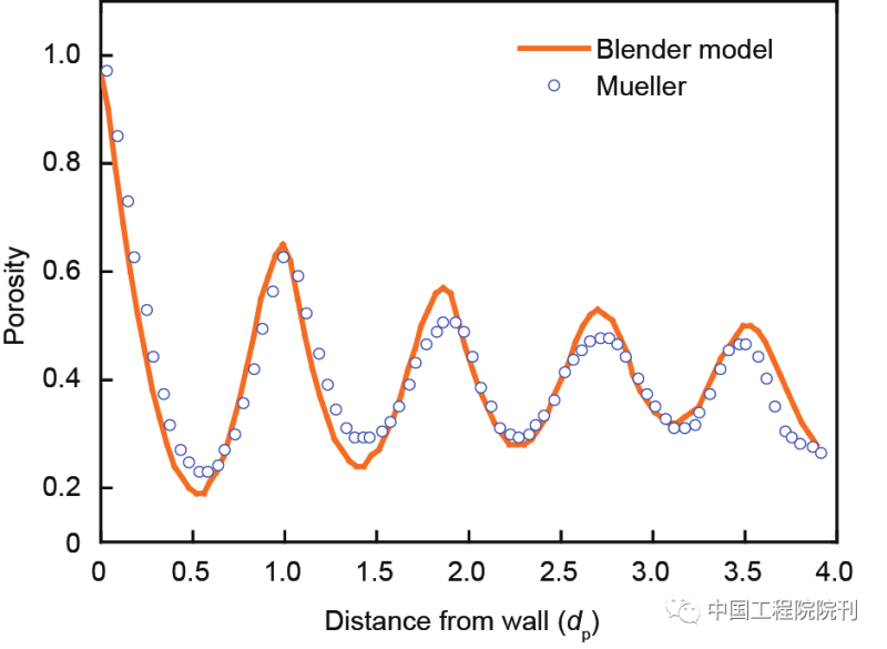 在圖2中,在Blender中建立了直徑比為7.99的模型,將徑向孔隙率與Mueller的結果進行了比較。由圖2 可知,兩條曲線均呈振蕩分布且吻合較好,從而驗證了模型的可靠性。此外,徑向孔隙率的振蕩分布表明堆積床不能處理成均勻多孔介質,這也進一步證明了建立三維模型的必要性。