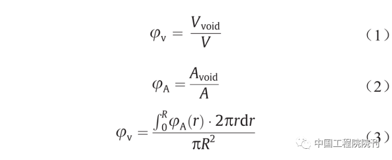 孔隙率是空隙體積與總體積的比率,而表面孔隙率是空隙面積與表面總面積的比率,如等式(1)~(3)所示。在這項研究中討論的徑向孔隙率是表面孔隙率。為了計算徑向孔隙率,沿徑向方向截取了一系列圓柱表面。對于每個圓柱表面,采用射線投射算法來確定球體內部區(qū)域。然后將所有球體內部面積相加,并用球體的總面積除以圓柱表面的面積,如圖1(b)所示。