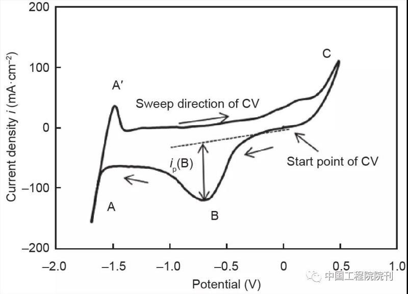 圖15含有MgOH+雜質(zhì)離子的MgCl2/KCl/NaCl熔鹽的典型循環(huán)伏安圖。反應A:Mg2++2e–=Mg(s);反應A′:Mg(s)=Mg2++2e–;反應B:MgOH++e–=MgO(s)+(1/2)H2(g);反應C:Cl–=(1/2)Cl2(g)+e–。T=500℃;工作電極材料:鎢;掃描速率:200 mV·s–1。ip(B):反應B的電流密度峰值。轉(zhuǎn)載自參考文獻,已經(jīng)Elsevier Ltd.許可,©2017