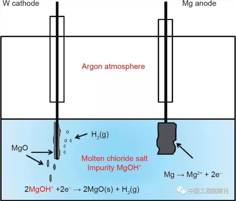 此外,陰極表面會被產(chǎn)生的電絕緣固體MgO鈍化。為避免Cl2等有毒氣體的產(chǎn)生和電極的鈍化,我們課題組在電解中使用了Mg陽極和脈沖電位對MgCl2/KCl/NaCl熔鹽進行純化,從而降低其腐蝕性,具體反應過程如下所示: