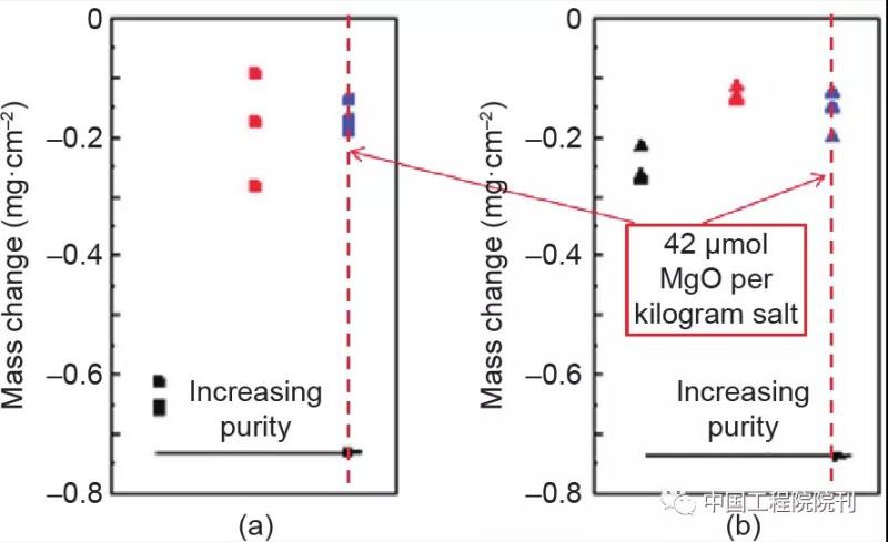 圖13在惰性氣氛及700℃下,隨著KCl-MgCl2鹽純度的提高,浸漬其中的SS 316L(a)和哈氏合金N(Hastelloy N)(b)的質(zhì)量變化。轉(zhuǎn)載自參考文獻,已經(jīng)Royal Society of Chemistry許可,©2019