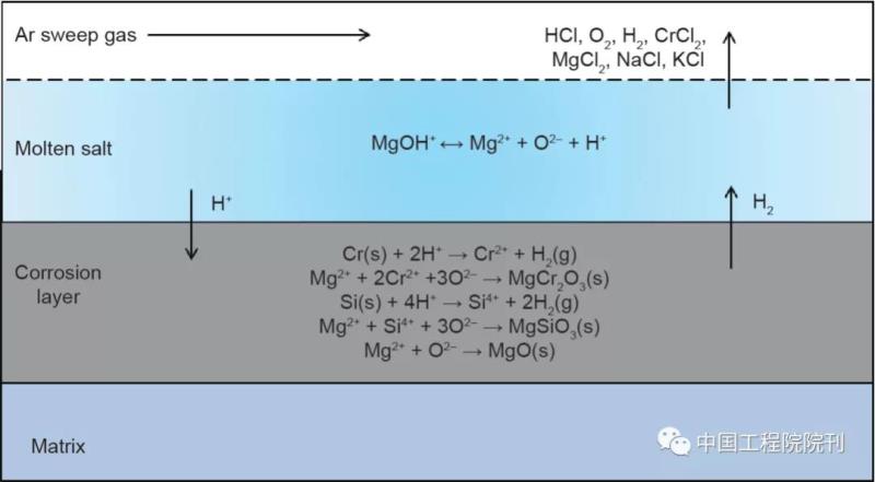 科研人員普遍認為,金屬結(jié)構(gòu)材料在高溫下與熔融氯鹽接觸后的腐蝕,是由熔融氯鹽中的腐蝕性雜質(zhì)(如MgOHCl)和氣體(如HCl)引起的。