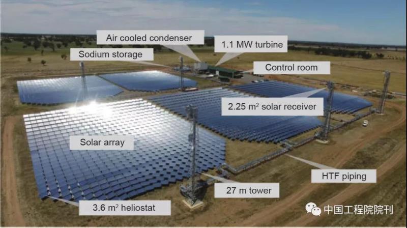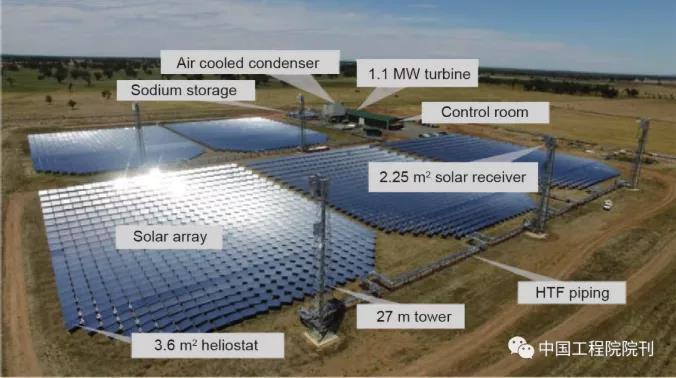 圖7位于澳大利亞新南威爾士州的Vast Solar CSP試驗電站,使用液態(tài)鈉金屬作為導熱介質(zhì),試驗電站設(shè)計儲電量和儲熱量分別為1 MW和6 MW