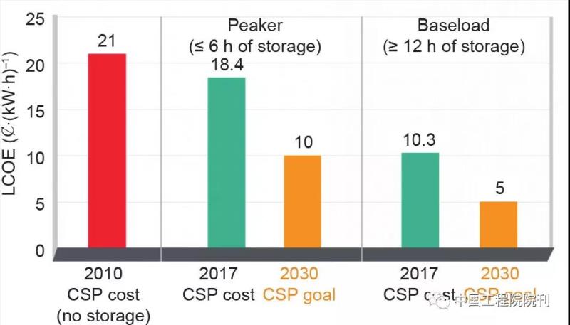 在其后續(xù)的“SunShot Initiative 2030”中,基本負荷CSP的LCOE目標是到2030年下降至0.05USD?kW–1?h–1。這樣低的LCOE將使CSP電站比大多數(shù)基于化石燃料的常規(guī)電站都更具成本競爭力。