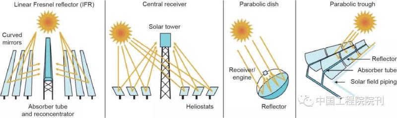 圖1 CSP技術(shù)的主要分類(從左到右):菲涅爾式、塔式、蝶式和槽式