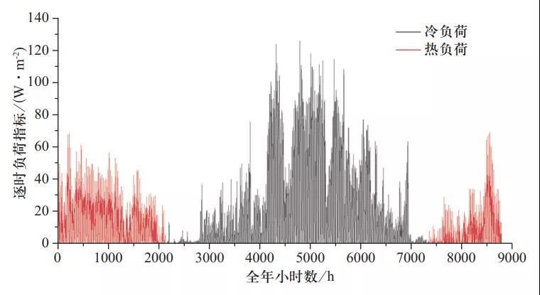 通過在全年尺度上的模擬計算,能夠得到各類型建筑逐小時的單位面積冷熱負荷指標。根據規(guī)劃階段的實際需求,為本項目中能源站提供了其供能區(qū)域全年的逐時冷熱負荷指標(如圖2所示),并將其總負荷的峰值作為該區(qū)域供能系統(tǒng)的冷熱負荷設計值,用以指導項目建設中的設備選型工作。