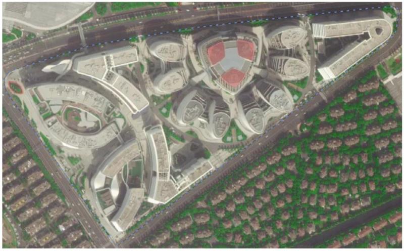 上海西虹橋1號能源站于2018年年初建成并投產。目前,該能源站為其規(guī)劃區(qū)域內占地面積約為160 hm2的大型建筑群供能。該項目是集商業(yè)、餐飲、辦公于一體的大型城市綜合體,其中包括了辦公、集中商業(yè)、街區(qū)商業(yè)等在內的多棟單體建筑,功能綜合性較強,建筑群衛(wèi)星圖如圖1所示。