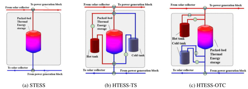 來自西安交通大學(xué)的研究人員提出了兩種新的混合式熱能儲存系統(tǒng)的設(shè)計方案,分別由填充床蓄冷蓄熱系統(tǒng)和雙罐蓄冷蓄熱系統(tǒng)組成,并給出了相應(yīng)的運(yùn)行策略:溫躍層儲存(HTESS-TS)和出口溫度控制(HTESS-OTC),如圖2所示。研究人員詳細(xì)介紹了HTESS-TS和HTESS-OTC的結(jié)構(gòu)和運(yùn)行策略。然后,比較了混合蓄冷蓄熱系統(tǒng)和僅包含獨(dú)立狀態(tài)的填充床蓄冷蓄熱的單罐儲能系統(tǒng)的熱性能和經(jīng)濟(jì)性能。分析了雙罐蓄冷蓄熱系統(tǒng)截止溫度和熱容量的影響。最后,在實(shí)際太陽輻射條件下,比較了不同蓄熱系統(tǒng)的聚光太陽能發(fā)電廠的全年性能。結(jié)果表明,與單罐蓄冷蓄熱系統(tǒng)相比,HTESS-TS和HTESS-OTC運(yùn)行策略的效用因數(shù)分別提高了12.5 %和22.1 %。同時,HTESS-OTC運(yùn)行策略的單位成本比單罐蓄冷蓄熱系統(tǒng)低了8.6%。此外,對于較寬的出口溫度限制范圍,HTESS-OTC運(yùn)行策略可以保持更穩(wěn)定的出口溫度,以及高于單罐蓄冷蓄熱系統(tǒng)的效用因數(shù)。與單罐蓄冷蓄熱系統(tǒng)相比,混合蓄冷蓄熱系統(tǒng)的溫躍層控制(HTESS-TS)和出口溫度控制系統(tǒng)(HTESS-OTC)的年度發(fā)電量分別提高9.8%和14.1%。