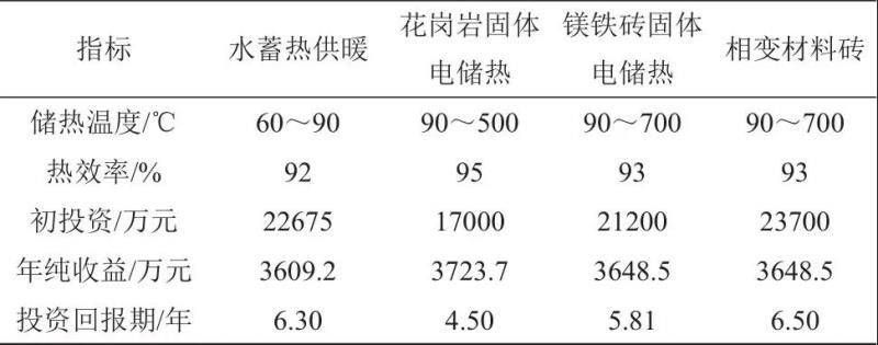國外對高溫固體電儲熱技術(shù)的研究始于20世紀(jì)70年代,到80年代初,歐洲部分發(fā)達(dá)國家已開始進(jìn)行實際應(yīng)用。Sorour對高溫固體電儲熱器進(jìn)行了優(yōu)化設(shè)計,發(fā)現(xiàn)蓄熱材料大小、高度、換熱流體流量以及輸入熱量是影響蓄熱性能的主要參數(shù)。Laing等開發(fā)了高溫混凝土蓄熱示范模塊,驗證了模塊在500 ℃的穩(wěn)定性以及200~500 ℃環(huán)境中長期儲熱的損耗。我國在高溫固體電儲熱技術(shù)應(yīng)用已達(dá)到國際領(lǐng)先水平,但是目前研究多為應(yīng)用形式的設(shè)計和經(jīng)濟(jì)性的分析,對于技術(shù)涉及的傳熱傳質(zhì)過程等基礎(chǔ)研究缺乏深入的探討。劉曉東設(shè)計了一種固體電儲熱供暖裝置,利用氧化鎂磚和熱管組成封閉的儲熱單元,降低氧化鎂磚固體的氧化速度。朱建新提出了一種帶預(yù)制固體熱能存儲裝置的供熱系統(tǒng),利用金屬傘裙把固體儲熱材料分段,減小大范圍開裂損壞的危險。葛維春等對固體電制熱儲熱供暖機(jī)組,利用室內(nèi)溫度需求、建筑物耗熱量、建筑物熱指標(biāo)、采暖季熱負(fù)荷、儲熱機(jī)組加熱功率與蓄熱量等5個指標(biāo)提出一種經(jīng)濟(jì)性配置方法。苗常海等通過臨界電價法分析水儲熱、高溫固體儲熱、市政供暖技術(shù)、相變電儲熱技術(shù)的經(jīng)濟(jì)性,發(fā)現(xiàn)水儲熱、高溫固體儲熱技術(shù)相比市政供暖更具經(jīng)濟(jì)可行性,且前者的經(jīng)濟(jì)性最好。曲弘等驗證了高溫固體電儲熱供暖技術(shù)對于實行峰谷電價地區(qū)的非居民項目具有顯著的經(jīng)濟(jì)效益。陳彬等分析了高溫固體電儲熱供暖技術(shù)不僅具有一定的經(jīng)濟(jì)效益,更可產(chǎn)生環(huán)境效益,增大低谷段的風(fēng)電和核電等清潔能源消納能力。表6為北京某供暖面積200萬m2電蓄熱方案經(jīng)濟(jì)性對比,從表中可以看出高溫固體電儲熱技術(shù)的經(jīng)濟(jì)性優(yōu)于水儲熱技術(shù),且采用花崗巖為固體儲熱介質(zhì)的經(jīng)濟(jì)性明顯好于以鎂鐵磚為固體儲熱介質(zhì)。