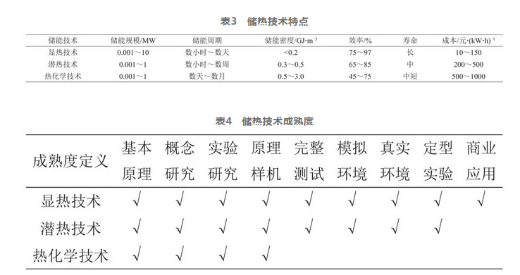 (2)儲熱技術(shù)可分為顯熱儲熱技術(shù)、潛熱儲熱技術(shù)和熱化學(xué)儲熱技術(shù)。顯熱儲熱技術(shù)具有儲熱規(guī)模大、壽命長、成本低、技術(shù)成熟度高等優(yōu)點,是研究最早、利用最廣泛、最成熟的技術(shù);潛熱儲熱技術(shù)具有儲熱密度高、放熱過程溫度近乎恒定的優(yōu)點,是目前主要研究和應(yīng)用熱點;熱化學(xué)儲熱技術(shù)具有更大的能量儲存密度可實現(xiàn)長期儲存熱能等優(yōu)點,但處于實驗室驗證階段。