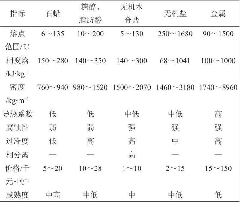 按照工作溫度,固-液相變材料又分低溫相變材料和高溫相變材料。其中,低溫相變材料主要包括聚乙二醇、石蠟和脂肪酸等有機(jī)物及無機(jī)水合鹽,中高溫相變材料主要包括無機(jī)鹽、金屬和合金等。不同的相變材料特點見表2。從表中可以看出,石蠟、無機(jī)水合物等低溫相變材料技術(shù)成熟度相對較高,已實現(xiàn)部分材料的示范應(yīng)用,但是仍存在導(dǎo)熱系數(shù)低、腐蝕性、過冷度和相分離等問題;無機(jī)鹽、金屬等中高溫相變材料雖然具有相變焓較大、密度較高等優(yōu)點,但是相關(guān)材料腐蝕性、過冷度等問題仍需要進(jìn)一步研究,目前技術(shù)成熟度較低,仍處于實驗室研究階段。