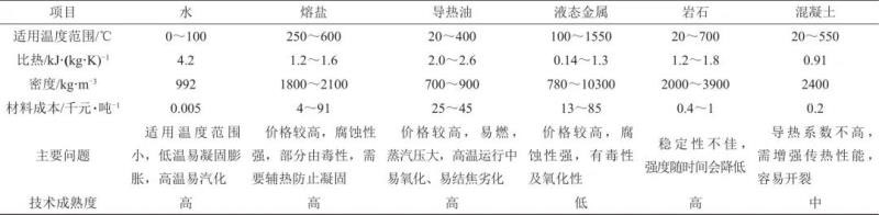 根據(jù)儲熱材料的相態(tài),常用的顯熱儲熱技術(shù)可以分為液體儲熱材料和固體儲熱材料。常見的液體儲熱材料包括水、熔鹽、導(dǎo)熱油、液態(tài)金屬等,固體儲熱材料包括巖石、復(fù)合混凝土等。不同顯熱儲熱材料特點見表1。其中,水、導(dǎo)熱油、巖石、混凝土等是最常見的低溫(<120 ℃)顯熱儲熱材料,導(dǎo)熱油、熔鹽、巖石、混凝土等也是常見的中高溫(120~600 ℃)顯熱儲熱材料,巖石和液態(tài)金屬也是超高溫(≥600 ℃)顯熱儲熱材料,但是液態(tài)金屬技術(shù)尚不成熟,處于研究階段。
