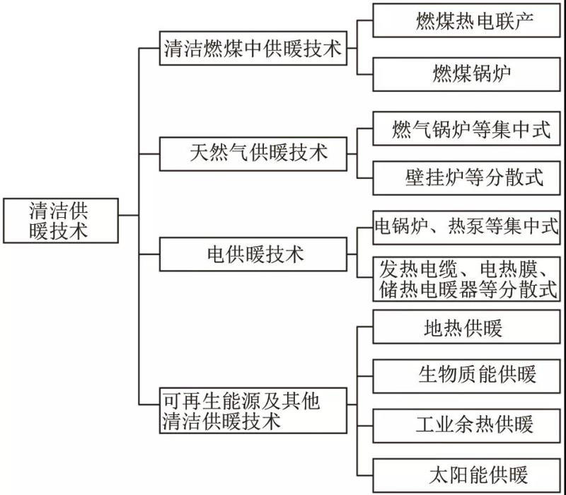 根據(jù)能源種類,清潔供暖技術(shù)可以分為清潔燃煤集中供暖技術(shù)、天然氣供暖技術(shù)、電供暖技術(shù)、可再生能源及其他清潔供暖技術(shù),見圖1。