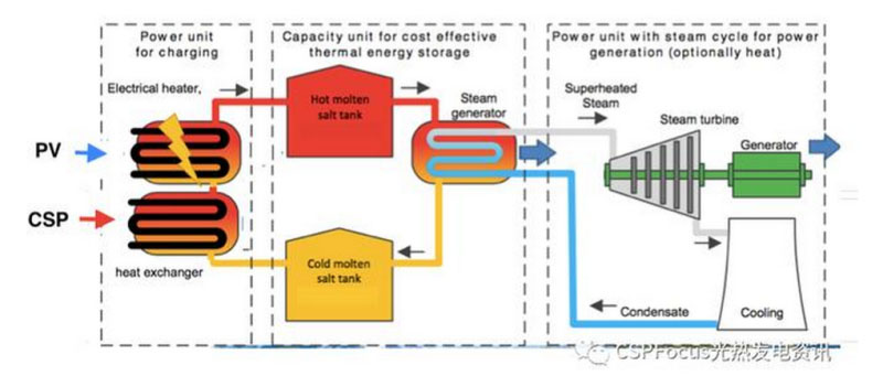 該技術(shù)思路的提出單位德國TSK Flagsol技術(shù)總監(jiān)Mark Schmitz也對此進行了詳細解釋:這是我們幾年前研發(fā)出的一個新概念,槽式光熱發(fā)電系統(tǒng)在正常運行時的工作溫度約在400℃左右,而蒸汽溫度越高對汽輪機提升電站整體發(fā)電效率更有利,因此我們想到將光伏系統(tǒng)中的多余電力也放入儲熱罐中,熔鹽通過電加熱溫度可達到565℃左右,大大提高了發(fā)電效率。