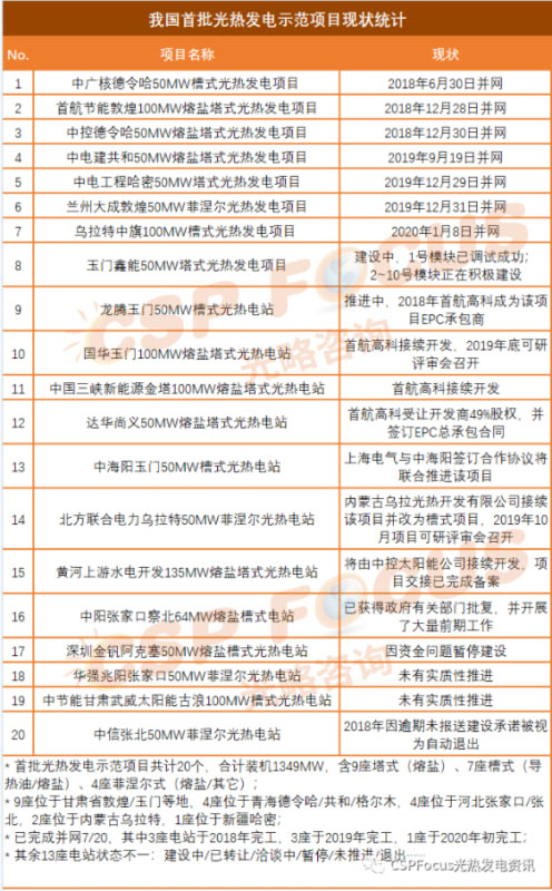 首批光熱發(fā)電示范項(xiàng)目共計(jì)20個(gè),合計(jì)裝機(jī)1349MW。技術(shù)路線上來看:含9座塔式(熔鹽)、7座槽式(導(dǎo)熱油/熔鹽)、4座菲涅爾式(熔鹽/其它);地理位置上看:9座位于甘肅省敦煌/玉門等地,4座位于青海德令哈/共和/格爾木,4座位于河北張家口/張北,2座位于內(nèi)蒙古烏拉特,1座位于新疆哈密。