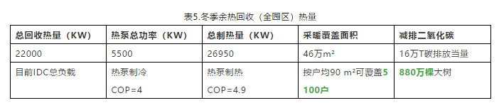 若考慮全年余熱回收,將夏季回收熱用于民用熱水及周邊公建需求,冬季將數(shù)據(jù)中心全部熱源用于民用采暖,由此減少的能耗極為可觀,同時(shí)采用此方案將減少制冷系統(tǒng)部分運(yùn)行費(fèi)用及園區(qū)辦公樓采暖費(fèi)用,累加售賣出去的余熱費(fèi)用,收益將極為可觀。在開展社會(huì)公益的同時(shí),也增加了執(zhí)行者的收益,讓綠色環(huán)保深入數(shù)據(jù)中心行業(yè)內(nèi)。