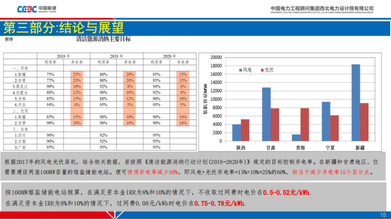 結(jié)論與展望,再來(lái)回顧一下前面幾張PPT提到的目標(biāo),2018年,2019年這些省份,根據(jù)2017年的裝機(jī),按照這個(gè)計(jì)劃目標(biāo)來(lái)講,在新疆和甘肅地區(qū),這兩個(gè)地區(qū)對(duì)它的電網(wǎng)裝機(jī)還有電力生產(chǎn)的特性比較熟悉,在新疆還有甘肅地區(qū)僅需要建設(shè)兩座一百兆瓦的熔融鹽儲(chǔ)能電站,配置的儲(chǔ)熱時(shí)間大概是10到12小時(shí),便可以使得氣電率減少60%,風(fēng)電加光伏的氣電率,減少氣電率15個(gè)百分點(diǎn)。大約是投資60億這個(gè)水平。再?gòu)?qiáng)調(diào)一下它的壽命應(yīng)該是很可靠的,25年應(yīng)該沒(méi)有問(wèn)題的。同時(shí)做了一個(gè)簡(jiǎn)單的財(cái)務(wù)測(cè)算,資本經(jīng)10%還有8%的前提下不收取過(guò)往費(fèi)時(shí),我這個(gè)就是回收氣電發(fā)出來(lái)的是5毛錢到5毛2每度,這里面一個(gè)背景跟剛剛談到的效率有關(guān)系,過(guò)往費(fèi)是這樣盈利的很脆弱的條件。