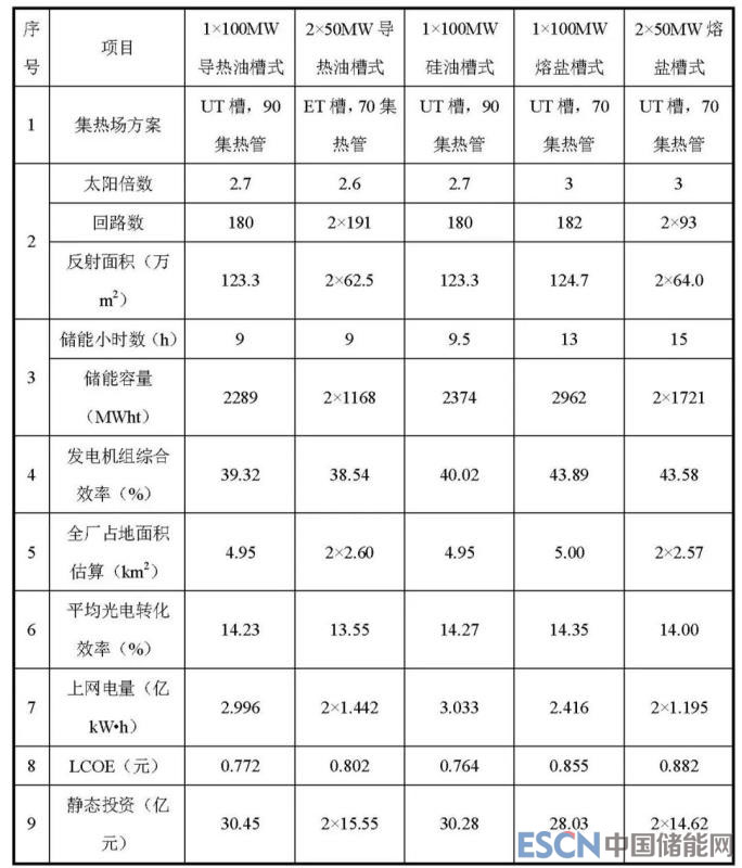 根據(jù)以上5種方案優(yōu)化結(jié)果,列各個方案最優(yōu)化結(jié)果如下表所示,主要方案包括:1×100MW導(dǎo)熱油槽式,2×50MW導(dǎo)熱油槽式,1×100MW硅油槽式,1×100MW熔鹽槽式,2×50MW熔鹽槽式。