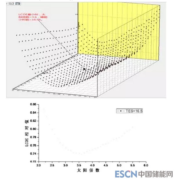 可以從圖紙中找到相應(yīng)的LCOE最低點,此時太陽倍數(shù)為3.6(對應(yīng)集熱場UT槽回路數(shù)為240,反射面積為164.4萬m2),儲能小時數(shù)為11.5h。此時靜態(tài)投資約為38.1(參考數(shù)據(jù))億元。