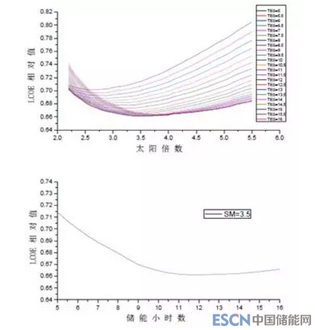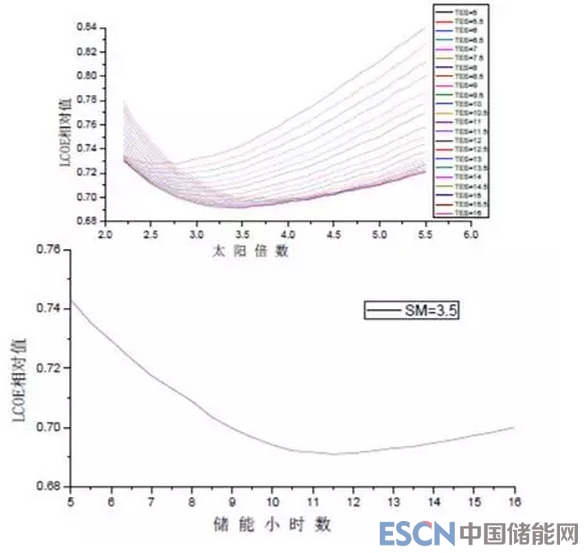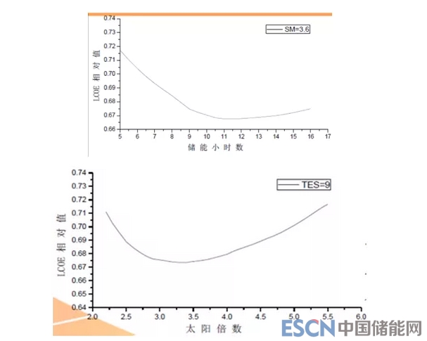 圖:100MW導(dǎo)熱油槽式電站LCOE在不同儲能小時下隨太陽倍數(shù)變化曲線