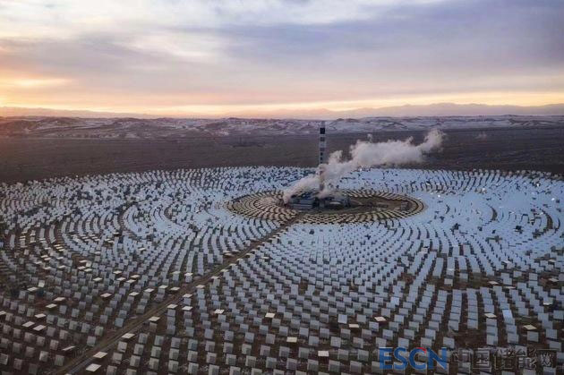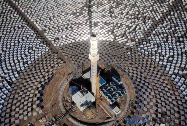 航拍光熱發(fā)電站——鏡場由12000多臺定日鏡組成,圍繞著高達(dá)260米的吸熱塔,總采光面積達(dá)140萬平方米