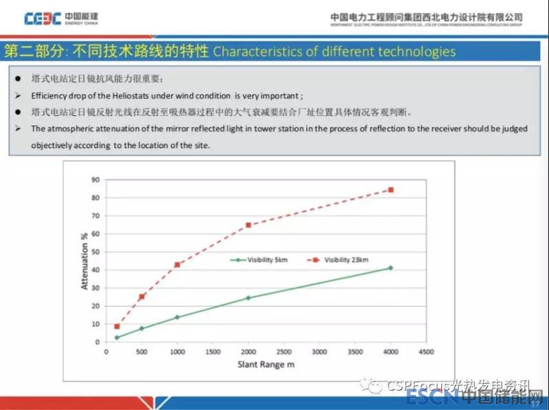 塔式電站有什么需要我們特別關(guān)注的問題呢,就是在項目選擇的時候,我想有兩個關(guān)鍵因素需要提醒。一個是抗風(fēng)能力,因為新疆哈密有一些地區(qū)風(fēng)非常大,塔式電站定日鏡誤差,包括運行中隨著不同的風(fēng)速,風(fēng)速越高誤差越大,會非常明顯的增大,導(dǎo)致性能下降。還有一個問題,大氣清潔度問題,比方說這跟實線是5公里的可見度模型和虛線23公里可見度模型,橫坐標(biāo)是定日鏡距離吸熱器的距離,縱坐標(biāo)是大氣衰減量,比如說100兆瓦的電站,最遠(yuǎn)的定日鏡距離吸熱器可能會到2000米,這里比較清潔的大氣條件模型下,反射鏡到吸熱器能量傳輸過程中,能量損失20%多。更糟糕的情況下是某個廠址某個季節(jié),或者全年空氣臟兮兮的,沙塵霧比較多就會更夸張,當(dāng)然實際中沒有這么夸張的清潔度,但是還是很重要的一個因素在選址的時候需要重視。日喀則大氣環(huán)境和德令哈、敦煌、玉門都不一樣,選擇的時候也是需要重視。