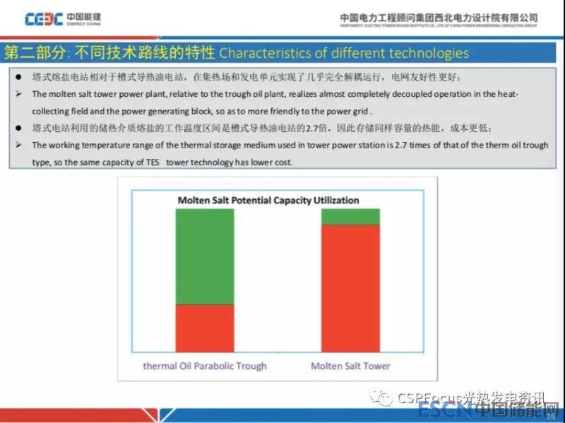 槽式和塔式都采用熔鹽作為儲熱介質(zhì),對于槽式電站溫度比較低,假設(shè)這根柱子高度代表熔融鹽總共儲能的能力(低溫不是按熔鹽凝固點,是按照朗肯循環(huán)回?zé)嵯到y(tǒng)決定的,大概290度),紅色代表熔融鹽儲能能力的利用情況,槽式只利用了33%,塔式熔鹽電站利用了90%,我們在393度的槽式電站中采用熔鹽儲鹽,并沒有把熔鹽儲能更充分利用。為什么強度熔鹽這個問題呢?我們知道國內(nèi)有一些項目,近年熔鹽成本高于前些年廣核德令哈項目招標(biāo)價30%,對100兆瓦的導(dǎo)熱油電站來說,這部分成本可能在2個多億,這就是一個比較致命的投資了。這么貴的東西要充分利用它才能更好地發(fā)覺其價值。
