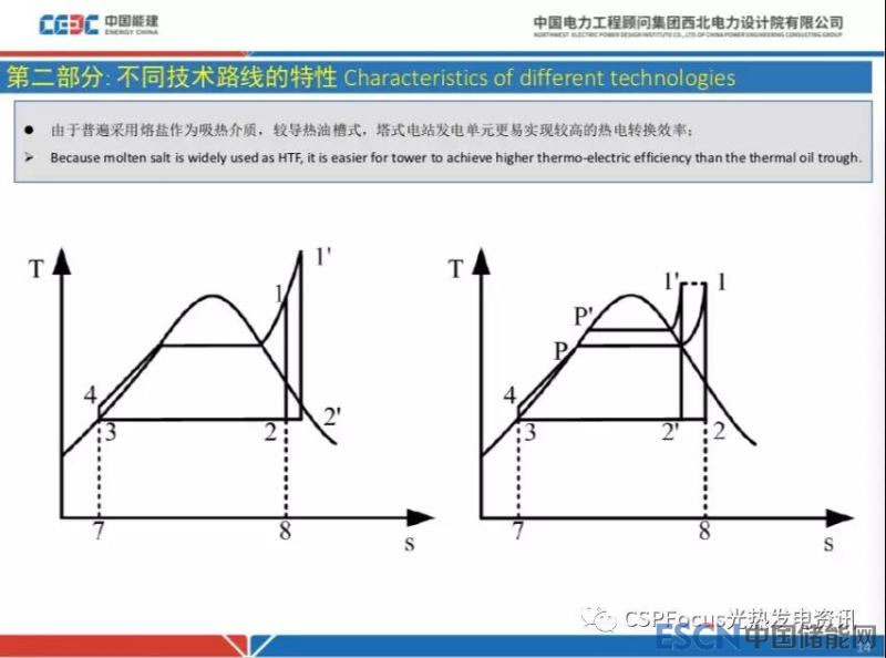 不同技術(shù)路線的特性,剛才談了前面光到熱環(huán)節(jié),后面熱到電的環(huán)節(jié)大家都比較清楚。由于普遍采用熔鹽作為吸熱介質(zhì),相比較槽式導(dǎo)熱油電站,塔式電站發(fā)電單元更容易實現(xiàn)較高的熱電轉(zhuǎn)換效率,這是一個典型的朗肯循環(huán)的圖,溫熵圖上面這段曲線右上角的點1和1’越高,做功介質(zhì)平均吸熱溫度越高,朗肯循環(huán)效率越高,這個很簡單很成熟。同樣的道理,壓力越高右邊這張圖P和P’越高,一樣可實現(xiàn)較高的熱電效率。
