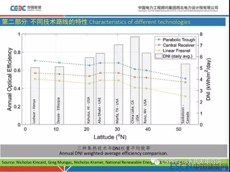 對于塔式電站來講,相對的受緯度高低影響沒有那么明顯。菲涅爾電站緯度高了之后,尤其超過40度之后,下降更高。新疆哈密大概44度,在中國我們需要把重點放在目前這幾個區(qū)域。