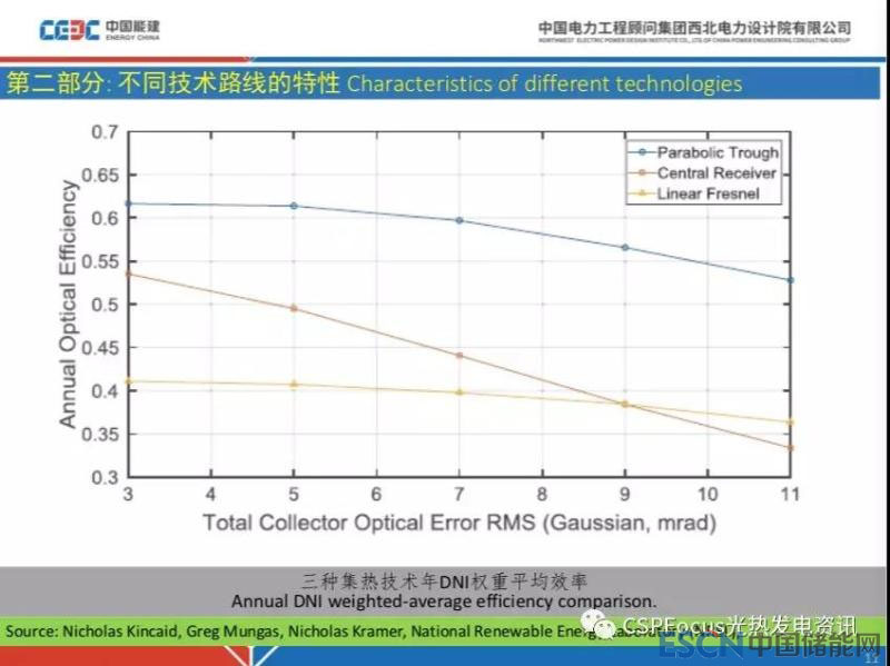 考慮這些因素以后,結(jié)合集熱場和定日鏡的誤差,包括跟蹤、反射鏡面型等,就有上面這組曲線。這組曲線藍線是槽式的,下降比較陡的是塔式,最下面的是菲涅爾。隨著誤差的增大,菲涅爾電站的總效率影響比較平緩,槽式次之,塔式最明顯。這就告訴我們,塔式電站定日鏡的設(shè)計效率偏離設(shè)計值的時候,可能給你的集熱場全年表現(xiàn)帶來非常糟糕的影響。也就是說菲涅爾電站的光學(xué)性能容錯能力比較強,通俗講技術(shù)難度比較低,現(xiàn)在要搞這個集熱器開發(fā),可能從菲涅爾入手比較簡單。塔式電站屬于精致活,主要是定日鏡,實際表現(xiàn)如果比較差的時候,可能這個電站就比較糟糕了,也有解救措施,大量增加定日鏡,這就要錢了。這個在工程應(yīng)用中很重要,關(guān)鍵設(shè)備都要考慮萬一的情況。