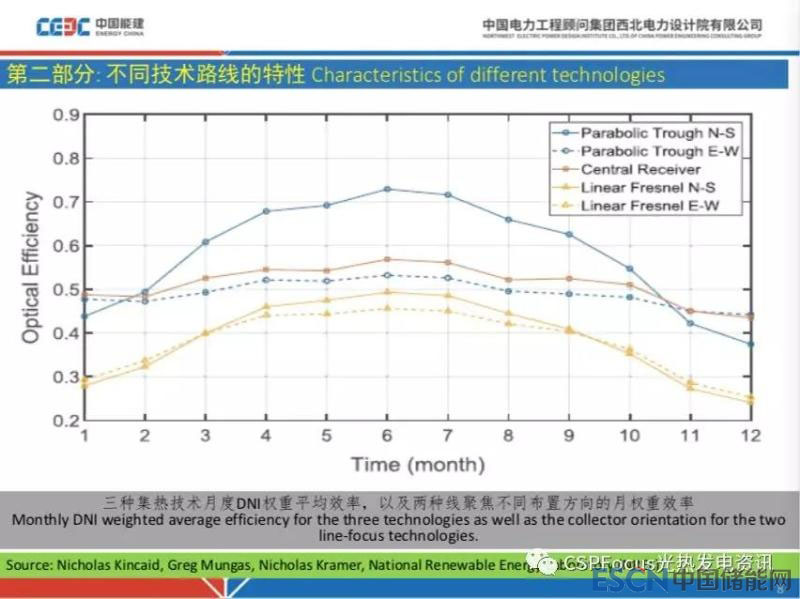 這就告訴我們,在一定緯度區(qū)域,從光學(xué)效率環(huán)節(jié)上講槽式電站有一定的優(yōu)勢,請記住,和緯度有一定的關(guān)系。槽式電站東西向布置和塔式電站效率表現(xiàn)類似,比較平穩(wěn),表現(xiàn)這兩根線隨月度變化沒有明顯的坡度。