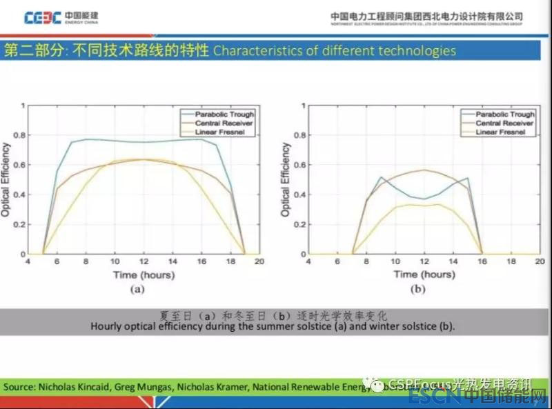 冬季情況不太一樣,北緯36度區(qū)域,槽式電站效率在每天中午前后各兩三個小時效率會比較低,表現(xiàn)為曲線在這一時段有一個谷;冬季情況下塔式電站效率變化和夏季一樣比較平穩(wěn),菲涅爾電站就更低了。這些原因主要跟塔式電站的雙軸跟蹤有關(guān)。時間原因這個不展開解釋。