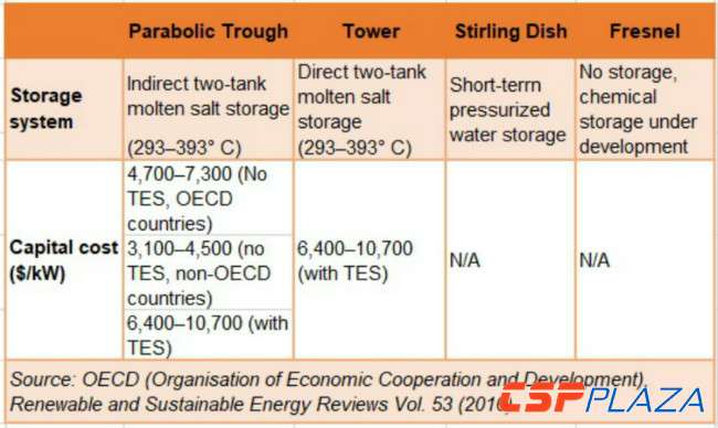 在每個(gè)電站中,由于儲(chǔ)能系統(tǒng)選用的技術(shù)類型和匹配容量的不同,其在光熱電站總成本中所占比例約為10%~20%。據(jù)國際可再生能源署IRENA發(fā)布數(shù)據(jù)顯示,隨著儲(chǔ)能溫度的逐步提高,儲(chǔ)能系統(tǒng)的設(shè)計(jì)不斷優(yōu)化,到2025年,拋物線槽式電站的儲(chǔ)能成本可降低38%,約26美元/kWhth;而塔式電站的儲(chǔ)熱成本則可降低17%,達(dá)到22美元/kWhth。美國能源部SunShot Initiative計(jì)劃的既定目標(biāo)是到2020年將儲(chǔ)能成本降至15美元/kWhth,有研究人員認(rèn)為,以目前的進(jìn)度可以預(yù)測,儲(chǔ)能部分的成本下降速度將會(huì)超出計(jì)劃預(yù)期。
