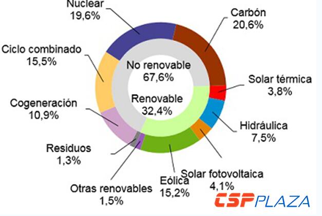 據(jù)西班牙有關(guān)部門(mén)發(fā)布的各類能源7月份發(fā)電量占比結(jié)果顯示,核能、煤炭、聯(lián)合循環(huán)、風(fēng)電分別占比20.6%、18.8%、17.8%和15.5%;熱電聯(lián)產(chǎn)、水力發(fā)電、光伏發(fā)電、廢料發(fā)電則分別占比10.8%、5.3%、4.2%與1.3%,其它可再生能源占比1.6%。其中,可再生能源發(fā)電量占比達(dá)31%,51.3%的發(fā)電量來(lái)自不排放二氧化碳的發(fā)電技術(shù)。