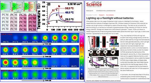最后,以廢熱富集、高效轉(zhuǎn)換利用為導向,通過器件的系統(tǒng)集成,研制了基于廢熱發(fā)電的熱電轉(zhuǎn)換器件。利用石墨烯(Graphene)平面單層結(jié)構(gòu)便于電子快速傳輸從而提供良好的導熱性,綜合石墨烯良好的導熱性能和相變材料較高的相變潛熱,王振洋團隊通過高溫蒸發(fā)和室溫下空氣中干燥的方法合成了一種新穎石墨烯和相變材料的復合材料,其中的石墨烯以三維網(wǎng)絡狀結(jié)構(gòu)被組裝在相變材料聚乙二醇(PEG)基質(zhì)中,為材料進行快速熱傳導提供了良好的通路。另外,該團隊首次證明G-PEGs的熱收集和存儲并為熱電設備提供熱源的能力。G-PEGs提供熱流通過熱電設備快速發(fā)電,可以點亮LED燈珠(Nanoscale, 2015, 7:10950;RSC Adv., 2017, 7:10683)。該工作并被“Atlas of Science”網(wǎng)站以“不用電池來點亮小手電”(“Lighting up a flashlight without batteries”)為題進行了相關報道,引起了同行們關注(http://atlasofscience.org/lighting-up-a-flashlight/#more-3618)。