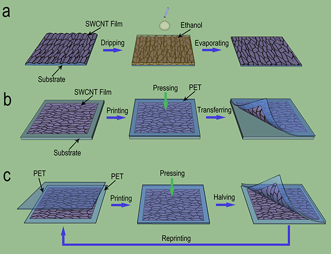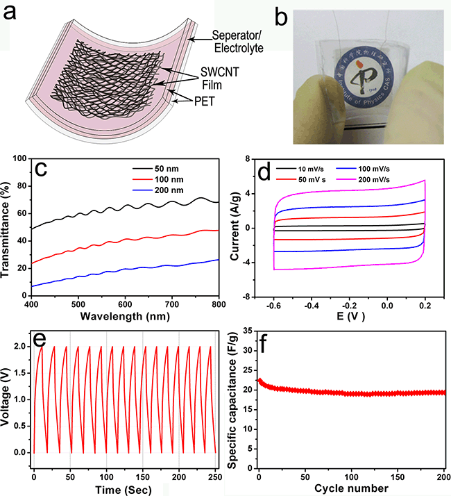 碳納米管透明薄膜是替代氧化銦錫(ITO)導電薄膜的理想材料,更重要的是有望廣泛地應用于柔性電子器件。利用浮動催化法直接制備的自支撐碳納米管薄膜具有獨特的二維連續(xù)網(wǎng)絡結(jié)構(gòu),從而具有優(yōu)異的電學和力學性能(Nano. Lett. 2007, 7, 2307)。但是由于受其制備條件的約束,小于100 納米的自支撐透明導電薄膜難以利用此方法直接來獲得,這限制了其進一步的應用。為了解決這一問題,他們發(fā)展了傳統(tǒng)的轉(zhuǎn)移印刷技術(shù),提出了一種基于靜電吸附的減薄碳納米管薄膜的方法——重復轉(zhuǎn)移印刷法,通過利用離子靜電吸附效應提高低表面能基底的表面能,使得碳納米管薄膜可以從高表面能的基底轉(zhuǎn)移到原本表面能較低的基底上。結(jié)合具有特殊二維網(wǎng)絡結(jié)構(gòu)的碳納米管薄膜與靜電吸附重復轉(zhuǎn)移印刷法,可在PET襯底上得到不同厚度甚至近于亞單層的超薄碳納米管薄膜,透明度可達90%以上。此方法不僅可以有效提高碳納米管的利用率,保持碳納米管薄膜的結(jié)構(gòu),還可以有效提高超薄碳納米管薄膜的制備效率,簡化了實驗過程。該方法正在申請中國發(fā)明專利(201210270061.0)?;谒苽涞某√技{米管薄膜,研究人員組裝了柔性透明碳納米管薄膜超級電容器,超級電容器表現(xiàn)出了一定的透光性和良好的電化學性能。相關研究結(jié)果發(fā)表在Small (DOI: 10.1002/smll.201201587)上,并得到編輯的較高評價。