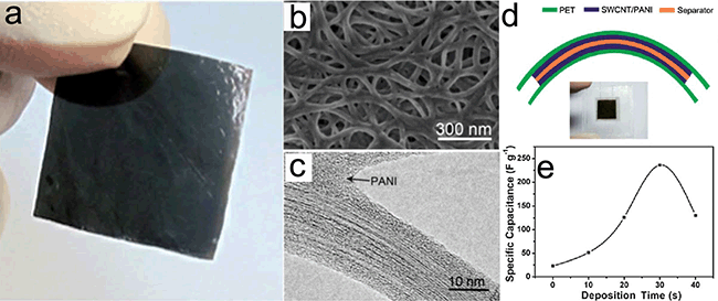 碳納米管薄膜具有高導電性和多孔結(jié)構(gòu),可以直接作為超級電容器的電極材料,但是由于碳納米管薄膜中的碳納米管一般是以管束的形式存在,管束內(nèi)部空隙尺寸在0.4 nm以下,電解液離子根本無法進入管束內(nèi)部的空隙,因此管束內(nèi)部碳納米管的表面對雙電層電容沒有貢獻,致使其有效比表面積大大減小,比電容較小。在碳納米管表面包覆導電聚合物,引進贗電容是提高碳納米管電極比電容的一種有效途徑。但是低電導率導電聚合物的加入導致碳納米管/導電聚合物異質(zhì)結(jié)構(gòu)電極的導電率與碳納米管相比會嚴重下降,影響超級電容器的功率密度。如何在利用導電聚合物提高能量密度的同時不降低超級電容器功率密度,是目前碳納米管/導電聚合物異質(zhì)電極制備的一個難題。他們以直接生長的自支撐碳納米管薄膜作為模板,利用電沉積的方法成功制備出了“骨架/皮膚”型的碳納米管/聚苯胺異質(zhì)結(jié)構(gòu)薄膜。在這種異質(zhì)結(jié)構(gòu)薄膜中,聚苯胺均勻包覆碳納米管薄膜中的碳管管束,碳管管束仍然保持良好的連續(xù)網(wǎng)絡結(jié)構(gòu),形成新的“骨架/皮膚”型碳納米管/聚苯胺異質(zhì)連續(xù)網(wǎng)格結(jié)構(gòu),確保異質(zhì)結(jié)構(gòu)薄膜具有高導電性。此結(jié)構(gòu)既充分發(fā)揮了碳納米管的高導電性,又發(fā)揮了導電聚合物贗電容的優(yōu)勢。獨立無支撐的碳納米管/聚苯胺異質(zhì)結(jié)構(gòu)薄膜具有非常好的力學性質(zhì),可以作為柔性超級電容器電極。與直接生長的碳納米管薄膜電極相比,基于碳納米管/聚苯胺異質(zhì)結(jié)構(gòu)薄膜的超級電容器電極的比電容提高了近一個數(shù)量級,并且在提高電極電流密度的同時,也保證其具有較高的功率密度。相關研究結(jié)果發(fā)表在Energy & Environmental Science(2012, 5, 8726)上,被編輯部選為Hot Paper進行了介紹,Chemistry World也以Skeleton and skin strategy improves supercapacitor為題進行了專門報道。