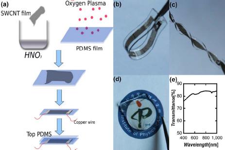 聚合物包埋的方法不需要引入離子液體等分散劑,也無需對(duì)碳管進(jìn)行超聲分散處理,具有簡單易行、環(huán)保無損的優(yōu)點(diǎn),非常適合直接生長的單壁碳納米管薄膜(Nano. Lett. 2007, 7, 2307)。研究人員制備出的彈性導(dǎo)體集碳納米管薄膜和彈性體聚合物的優(yōu)點(diǎn)于一身,具有很好的透光性、導(dǎo)電性和可拉伸性能:可見光透光率高達(dá)60%,同時(shí)面電阻只有幾十歐姆;在受到高達(dá)50%的反復(fù)拉伸應(yīng)變時(shí),可以保持良好的、穩(wěn)定的導(dǎo)電性。他們認(rèn)為,如此好的可拉伸性能一方面來源于碳納米管獨(dú)特的一維特性,另一方面聚合物的引入可以有效地減弱應(yīng)力集中、保持碳納米管薄膜在電學(xué)上的完整性。