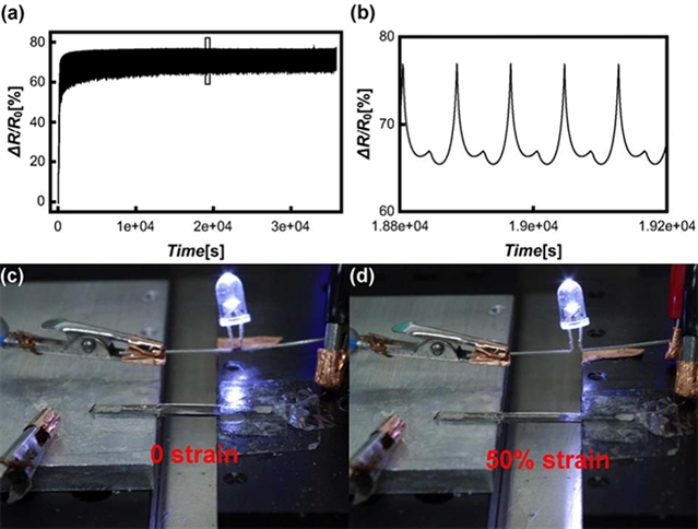 圖2 (a) CNT/PDMS透明彈性導(dǎo)體在反復(fù)拉伸應(yīng)變下的電阻變化(拉伸500次);