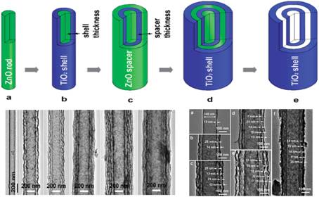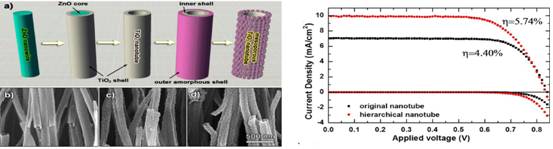 基于課題組在氧化物納米結(jié)構(gòu)研究的多年積累,采用超長ZnO納米線陣列為模板,結(jié)合可精確調(diào)控納米微結(jié)構(gòu)的連續(xù)離子層吸附與反應(yīng)(SILAR)技術(shù),成功實現(xiàn)了TiO2納米管陣列在FTO導(dǎo)電基底上的直接生長;采用獨特的水熱粗化技術(shù),顯著提高了納米管陣列的表面粗糙度、結(jié)晶性和染料負載量。所得TiO2納米管陣列光陽極的光電轉(zhuǎn)換效率為5.74%,比無粗化納米管陣列提高30%。在此基礎(chǔ)上,課題組通過在ZnO納米柱表面連續(xù)沉積多層TiO2、ZnO薄層,獲得了同軸、多壁TiO2納米管光陽極,并可精確調(diào)控管壁的層數(shù)(1-6層)及厚度(5-15 nm);通過生長枝狀ZnO并構(gòu)建ZnO-TiO2核殼結(jié)構(gòu),制備出具有枝狀結(jié)構(gòu)的TiO2納米管光陽極。