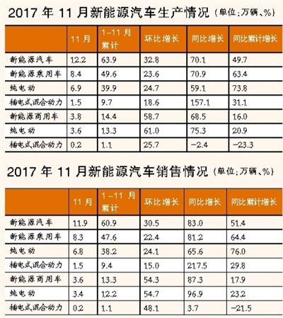 中國儲能網(wǎng)訊:中國汽車工業(yè)協(xié)會(簡稱“中汽協(xié)”)12月11日發(fā)布的數(shù)據(jù)顯示,11月,新能源汽車產(chǎn)銷分別完成12.2萬輛和11.9萬輛,環(huán)比分別增長32.8%和30.5%,同比分別增長70.1%和83%。中汽協(xié)秘書長助理許海東在現(xiàn)場預(yù)測,“今年完成新能源汽車70萬輛的銷售目標肯定沒問題,2018年的新能源汽車銷量有望破百萬。”