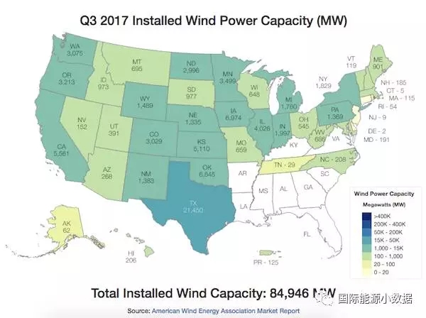 中國儲能網(wǎng)訊:根據(jù)美國風(fēng)能協(xié)會的最新數(shù)據(jù),到2017年9月底止全美風(fēng)電裝機累計達(dá)到84.946吉瓦,其中德克薩斯一個州就有21.450吉瓦,占全國總裝機的25%;其次為愛荷華州(6.974吉瓦)、俄克拉荷馬州(6.645吉瓦)、加利福尼亞州(5.561吉瓦)、堪薩斯州(5.110吉瓦)。