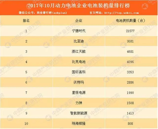 2017年10月動力電池企業(yè)電池裝機(jī)量前十排名依次為寧德時(shí)代、比亞迪、浙江天能、比克電池、國軒高科、沃特瑪、星恒電源、力神、智航新能源、珠海銀隆。