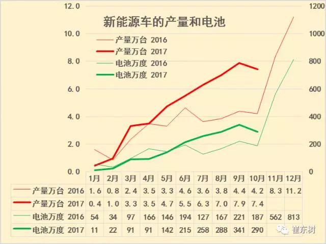 根據(jù)崔東樹個(gè)人測算,按照汽車生產(chǎn)合格證數(shù)據(jù):2017年10月新能源汽車產(chǎn)量7.4萬臺(tái),增長76%;電池裝機(jī)總電量約290萬度,同比增長55%。由于10月生產(chǎn)時(shí)間短,10月新能源汽車產(chǎn)量環(huán)比9月下降6%,鋰電池裝車量環(huán)比9月下降15%。從1-9月的汽車走勢看,電池需求和整車數(shù)量都是是逐步增長狀態(tài),尤其是在常規(guī)車型持續(xù)低迷的背景下,新能源車持續(xù)環(huán)比增長是令人振奮的。而10月的環(huán)比下降主要是工作日時(shí)間等影響,并非產(chǎn)銷的動(dòng)力不強(qiáng)的問題。