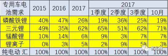 專用車的三元化趨勢很明顯。1-10月的三元電池的裝車量達(dá)到62%的占比,而16年的占比是35%.10月達(dá)到71%,三元提升的趨勢相對是合理的狀態(tài)。