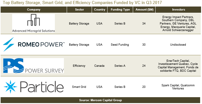第三季度,單筆風(fēng)投數(shù)目最大的是Advanced Microgrid Solutions獲得來(lái)自GE Ventures、Macquarie Capital等多家投資公司共計(jì)3400萬(wàn)美元風(fēng)投資金。同期,全球共計(jì)16家投資企業(yè)(投資商)參與電池儲(chǔ)能投資,其中下游企業(yè)占據(jù)最大份額。