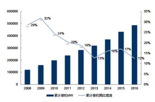 2016 年行整體增速放緩。 風(fēng)電行業(yè)一直保持著世界增長最快的能源地位。在 2001 年至 2015 年間,全球風(fēng)電累計裝機容量的年復(fù)合增長率為 22.99%, 累計總裝機容量從 23,900MW 增至 432,883MW。 而2016 年全球風(fēng)電市場新增裝機容量 54.6GW,同比下滑 14%。 截止 2016 年底,全球累計裝機容量達(dá)到 486.7GW。