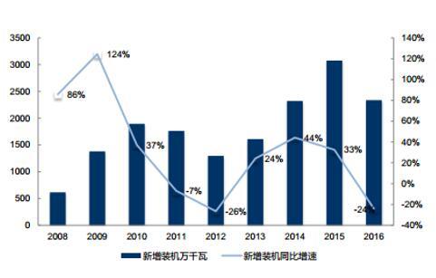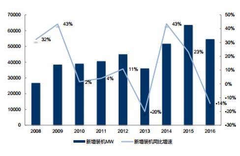 綜合國內(nèi)外的數(shù)據(jù)來看, 截至 2016 年,我國風(fēng)電新增裝機達(dá)約占全球風(fēng)電市場份額的42.7%,以絕對優(yōu)勢領(lǐng)跑全球風(fēng)電市場。而 2016 年國內(nèi)市場經(jīng)歷了風(fēng)電搶裝后的回調(diào), 同時疊加電力需求下降和電網(wǎng)消納風(fēng)電能力不足, 導(dǎo)致國內(nèi)市場的裝機容量明顯下滑,進(jìn)而全球市場風(fēng)電新增裝機容量隨之下滑。